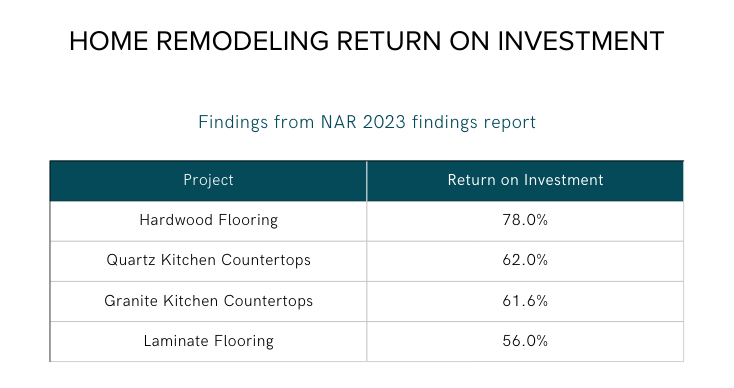 The National Association of Relators releases research yearly about their key findings, trends and insights into the estimated costs and return on investment that the real estate industry see in remodeling projects. For 2023 it was found that a Hardwood Flooring project will bring you a 78% return on your investment! Updating to Granite or Quartz countertops will bring you a 62% return on your investment. Laminate flooring shows a 56% return.